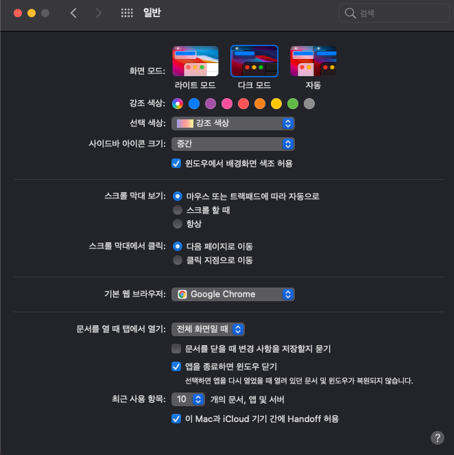 - 애플자체 [환경설정] - [일반] - 문서를열때 탭에서 열기 '안함' 으로 변경