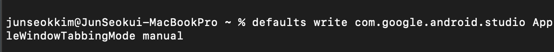 - defaults write com.google.android.studio AppleWindowTabbingMode manual
