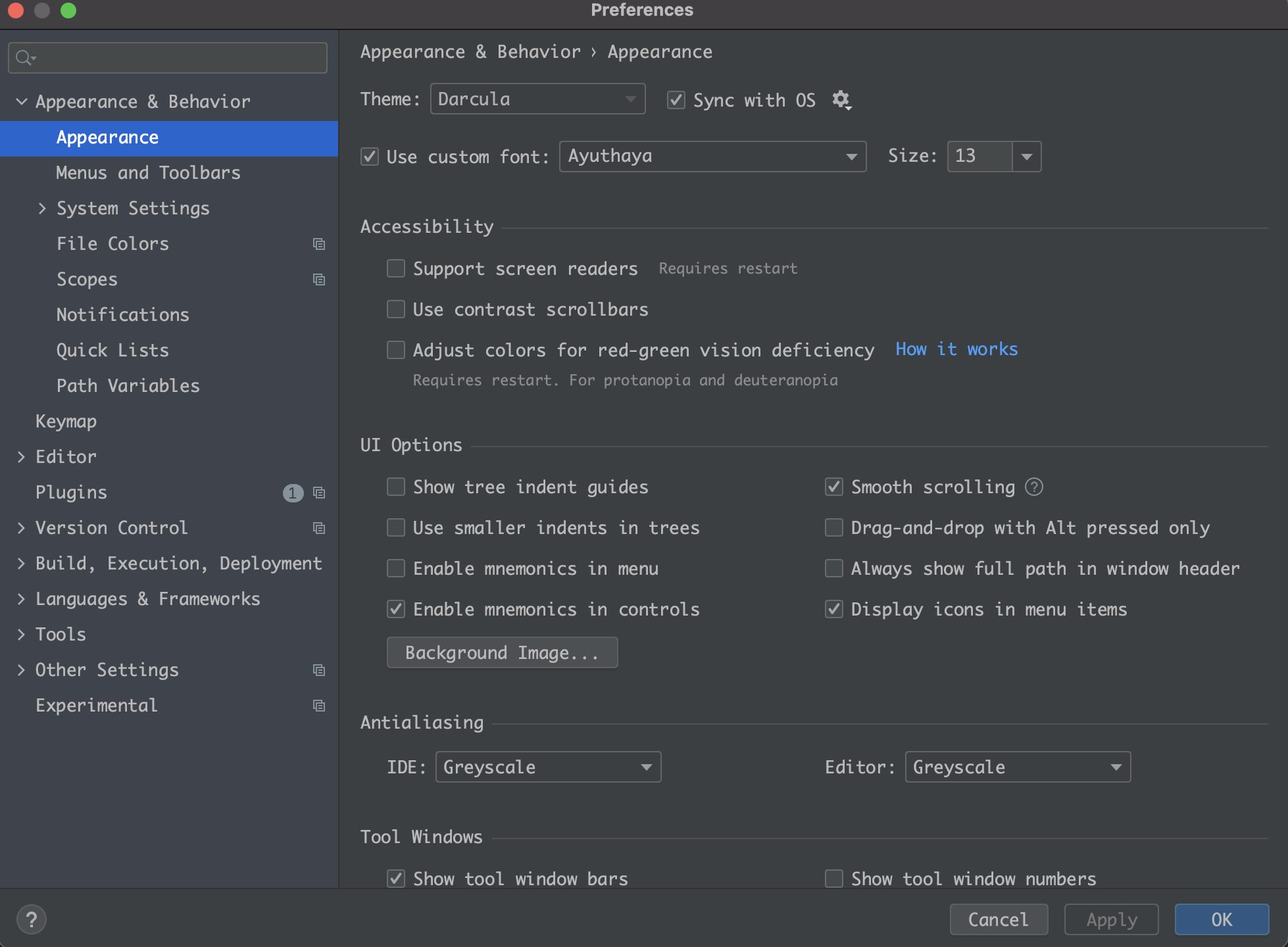 Preferences > Appearance & Behavior > Appearance > Use custom font 체크
